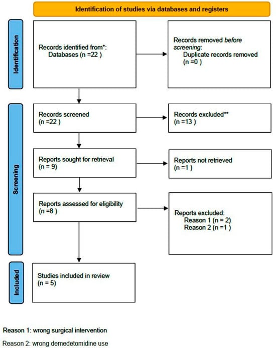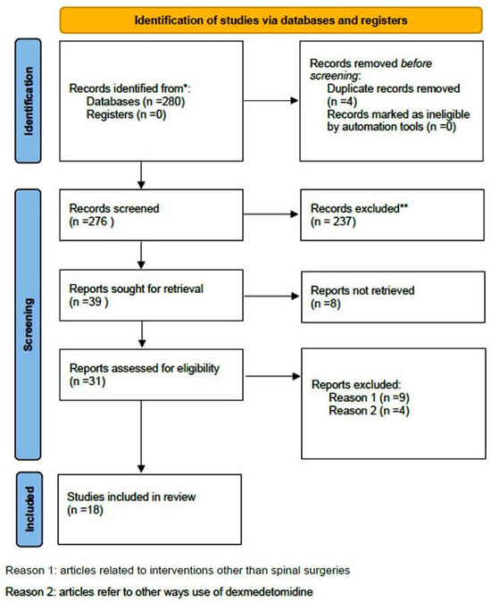 A comprehensive computer-based literature search was conducted on 02/05/2025 to investigate the use of dexmedetomidine (DEX) in relation to postoperative pain control, cognitive function, and spinal surgery. The databases searched were Web of Science (1900 to present) and PubMed (1947 to present). The search methodology used a combination of the terms “dexmedetomidine [All Fields]”, “spinal surgery [All Fields]”, “pain control [All Fields]”, and “delirium” [All Fields]. Duplicate records were removed using Zotero version 6.0.10 (Digital Scholar, https://digitalscholar.org/, accessed on 20 April 2025 ). The systematic review was conducted according to PRISMA guidelines and is presented in the following PRISMA flow charts (Figure 1 and Figure 2). Moreover, the study was registered in the PROSPERO (International Prospective Register of Systematic Reviews) database with registration number CRD420251082437, and full access to the protocol is provided.
