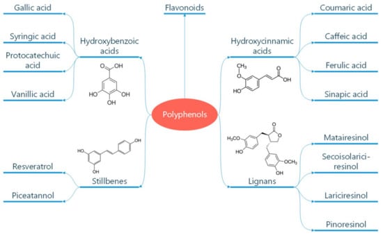 Classification of polyphenols. Polyphenols are natural compounds found in plant-based foods and beverages. Their classification into different subclasses like phenolic acids, flavonoids, stilbenes, and lignans is reported. The chemical formula of these molecules is also reported. Reproduced with permission from Caiati et al. [].