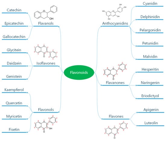 Classification of flavonoids. Flavonoids are a subclass of polyphenols and can be classified into flavonols, flavones, isoflavones, flavanones, antho-cyanidins, and flavanols based on their ring structure as illustrated here. Flavonoids have diverse biological activities and potential health benefits, including antioxidant and anti-inflammatory effects. Reproduced with permission from Caiati et al. [].