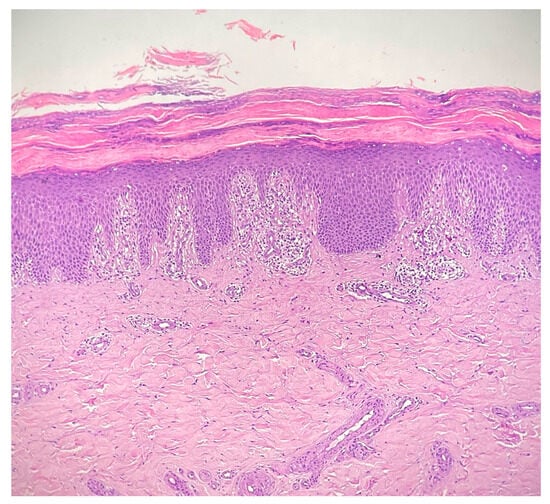 Complete blood count, liver and renal function tests as well as the complete autoimmunity panel and thyroid function tests were within normal limits. In particular, the anti-nuclear antibody, anti-double-stranded DNA antibody, anti-Scl-70 antibody, anti-neutrophil cytoplasmic antibody, and rheumatoid factors were negative. The erythrocyte sedimentation rate and complement C3 and C4 levels were normal; a screening test for hepatitis viruses was negative as well as the screening for malignancies. Skin biopsy of the sole of patient’s left foot showed diffuse basal vacuolopathy with spongiosis and hyperkeratosis that focally blurred the dermal–epidermal junction, which was consistent with the diagnosis of CLP (see Figure 2). Unfortunately, additional specific data or labwork investigations related to the patient were not available.