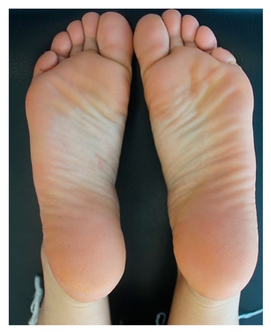 On physical examination, the patient was afebrile with a normal heart rate, normal blood pressure, normal oxygen saturation while breathing ambient air; the abdomen was normal to palpation with no rebound tenderness, guarding, palpable masses, or hepatosplenomegaly. Capillary refill was normal, and there was no palpable lymphadenopathy. No further signs of malar rash or abnormalities in the finger and toe extremities were noted. Neurologic examination, including assessment of cranial nerves, strength and sensation, was normal. The body mass index (the weight in kilograms divided by the square of the height in meters) was 20.07. Upon specific dermatological examination, a few small red papules were seen on the ankles and Achilles tendons, but mostly erythematous scaly plaques with well-defined borders on the soles of feet were evident with well-defined flaky plaques extending from the sole to the lateral regions of both feet (see Figure 1). Wickham’s striae were not visualized at the dermoscopy. No associated nail, hair, or mucosal abnormalities were noted.