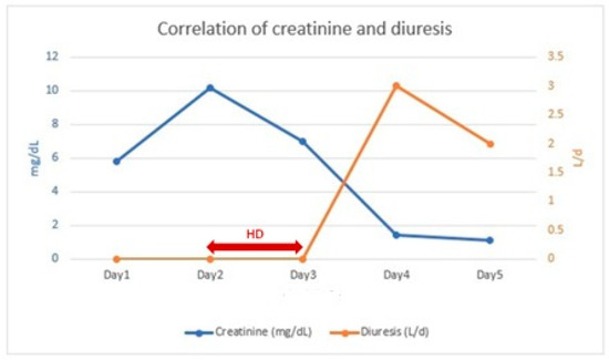 Within 24 h after the second HD session, the patient exhibited a urine output of 3010 mL/24 h and a decrease in serum creatinine to 1.46 mg/dL (Figure 2). In the following 24 h, renal function continued to improve (sCr: 1.19 mg/dL) with a urine output of 2000 mL/24 h.