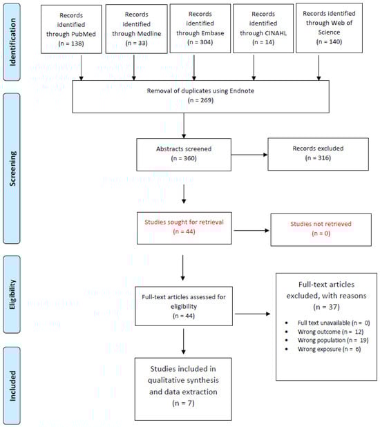 Figure 1 outlines the study selection process for our systematic review. A comprehensive literature search across five databases—PubMed (n = 138), Embase (n = 304), Medline (n = 33), CINAHL (n = 14), and the Web of Science (n = 140)—yielded a total of 629 records. After removing 269 duplicates via EndNote, 360 unique records were screened based on titles and abstracts. This initial screening led to 44 full-text articles being assessed for eligibility. Following full-text evaluation, 37 articles were excluded due to reasons such as wrong outcome (n = 12), wrong population (n = 19), and wrong exposure (n = 6), resulting in 7 studies that were included in the final qualitative synthesis.