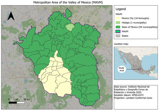 The study area comprised the Metropolitan Area of the Valley of Mexico, which included 16 boroughs of Mexico City, 59 municipalities of the State of Mexico, and one municipality of Hidalgo, and is located at 2240 m above sea level [20] (Figure 1). Covering an area of approximately 7845 km2, the MAVM is home to 21.8 million people [18], making it one of the most densely populated urban regions in the world. It is also the country’s most important economic hub, generating the highest Gross Domestic Product (GDP) nationally [16]. The region’s demographic and socioeconomic diversity, coupled with its unique geographical features—such as its high elevation and semi-enclosed basin topography—makes it a critical setting for investigating health inequities and the spatial distribution of non-communicable disease mortality.
