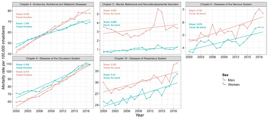 Figure 3. Temporal trends in mortality rates (per 100,000 inhabitants) by sex for non-communicable diseases in the MAVM from 2000 to 2019.