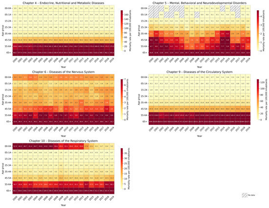 Notably, women exhibited higher mortality rates ( M R ¯ = 87.2 ) than men ( M R ¯ = 81.2 ) for Chapter 9. For the remaining chapters, men generally showed higher rates. A remarkable temporal shift was observed in Chapter 4: while women initially had higher mortality rates ( M R ¯ 2000 2008 = 52.9 ), male mortality ( M R ¯ 2009 2019 = 71.88 ) surpassed that of females after 2008 (Figure 3).