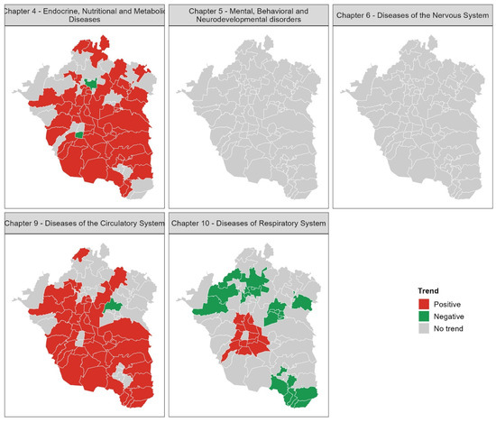 For Chapter 10, 11 municipalities showed significant positive trends, with 9 located in Mexico City and 2 in the State of Mexico. These municipalities are concentrated in a region known for persistent poor air quality. Notably, the Cuauhtémoc borough of Mexico City, despite being located in the same area of poor air conditions, showed no significant trend. Additionally, 21 municipalities in the State of Mexico presented negative trends for Chapter 10, predominantly located at the periphery of the MAVM, representing the highest number of municipalities with decreasing mortality trends for any chapter (Figure 5). These results provide evidence of spatial heterogeneity in mortality trends within the MAVM over the last two decades.