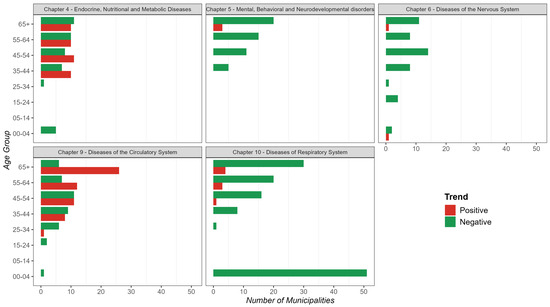 Figure 7. Number of municipalities grouped by temporal trends (positive or negative) in mortality, stratified by age group and ICD-10 disease chapter.