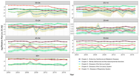 This pattern of residual autocorrelation highlights that, while linear models provide insight into overall age-specific trends, more complex temporal structures might be present in specific age-disease dynamics, where autocorrelation was significant. A detailed summary of all Ljung–Box test results for each age group and disease chapter model is provided in Supplementary Table S3.