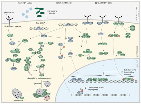 Interconnection between autophagy and inflammatory pathways. Under high-nutrient conditions, the mechanistic target of rapamycin (mTOR) is activated, leading to the inhibition of the autophagic pathway, which involves the initiation, elongation, maturation, and fusion of the autophagosome [37,46,47]. Inflammation signaling typically results in the activation of NF-κB, which can occur through canonical or non-canonical mechanisms. The canonical activation of NF-κB is initiated by the binding of growth factors to tumor necrosis factor (TNF) or toll-like receptors (TLRs), which activate TNF receptor-associated factor (TRAF) proteins. This leads to the activation of the IKK complex, degradation of IKB, and translocation of the NF-ĸB1-RelA complex into the nucleus to activate proinflammatory genes. In contrast, the non-canonical pathway is triggered by signals from TNF receptors that activate the NF-ĸB-inducing kinase, leading to IKK activation [48,49,50,51]. TLR4 signaling also induces the JAK/STAT pathway, another critical component of inflammatory signaling [24,52,53]. Autophagy and inflammation are connected through the DNA damage response. DNA damage activates the cytosolic DNA sensors cGAS and STING, which, in conjunction with ATM, can stimulate both inflammatory responses and autophagic vesicle formation, as well as the central cell-cycle regulator p53 [54,55,56,57]. Proteins analyzed by miRNA interactions are illustrated in green.