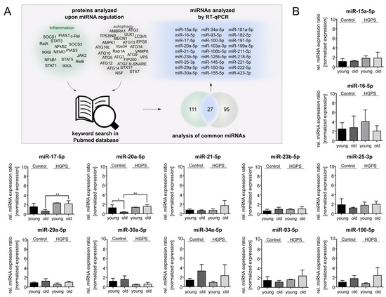 Identification and profiling of miRNAs regulating autophagy and inflammation pathways in control and HGPS. (A) Literature search procedure. Proteins from both autophagy and inflammation pathways were examined for miRNA regulation, and overlapping miRNAs were analyzed using RT-qPCR. (B) RT-qPCR analysis. miRNAs identified through text mining were analyzed in normal and HGPS fibroblasts during replicative senescence. Control fibroblasts (GMO1651c, GMO1652c, GMO3349c, GMO1582B) and HGPS fibroblasts (HGADFN127, HGADFN188, HGADFN003) were compared at passages with a replicative senescence under 5% (young) and over 20% (old) intragroup, as well as same-aged groups. Relative expression levels were normalized to U6 small nuclear 1 (RNU-6). Graphs show mean values ± standard deviation. Statistical significance was calculated using ANOVA with Tukey’s post hoc test (* p < 0.05, ** p < 0.01, (control: n = 4, HGPS: n = 3)). Non-significant changes are not indicated.