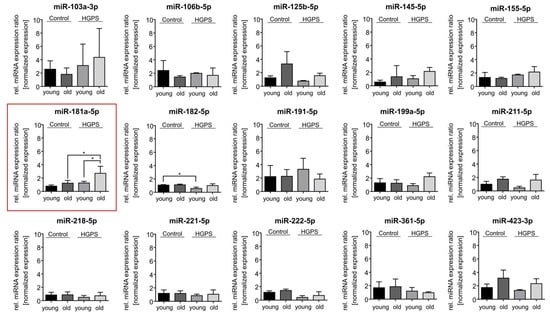 To investigate the impact of miRNAs on HGPS progression, we cultured HGPS primary fibroblasts (HGADFN127, HGADFN003, HGADFN188) alongside control fibroblasts (GMO1651c, GMO1652c, GMO3349c, GMO1582B) and performed qPCR screenings for the 27 overlapping miRNAs (Figure 2B). To differentiate between early- and late-passage fibroblast cultures, we determined the senescence index. Young fibroblasts exhibit a low senescence index (<5%) and remain highly proliferative, whereas old cultures with a senescence index over 20% show reduced replicative potential [63,64]. The senescence index thus provides a passage-independent measurement of cellular aging by detecting senescence-associated β-Galactosidase activity, a hallmark of senescent cells [41]. This method enabled normalization of the relative age of fibroblast cultures for miRNA expression analysis. qPCR analysis revealed distinct miRNA (miR) expression patterns during cellular aging. miR-20a-5p was downregulated in aging of control fibroblasts, whereas this decline was not observed during aging of HGPS fibroblasts. Comparing old control and old HGPS cells, miR-17-5p and miR-20-5p were significantly increased in HGPS cells (Figure 2B). miR-181a-5p was markedly upregulated in old HGPS fibroblast cultures compared to their younger counterparts. Additionally, miR-182-5p was downregulated in young HGPS cells compared to the controls (Figure 2B). Other miRNAs displayed trends of up- or downregulation. However, these changes were not statistically significant (Figure 2B).