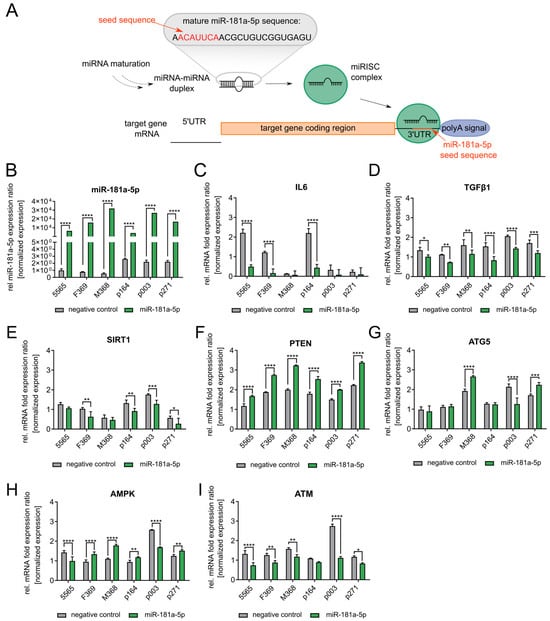 Evaluation of miR-181a-5p’s predicted targets using an miR-181a-5p mimic. Cell strains used: Control (GMO5565, HGFDFN369, HGMDFN368) and HGPS (HGADFN003, HGADFN164, HGADFN271) fibroblasts with a senescence index lower than 5%. (A) Schematic representation of miR-181a-5p’s binding to the target gene. After miRNA maturation, an miRNA-miRNA duplex is formed and loaded into the miRISC complex to recognize the seed sequence of the miRNA at the 3′UTR and repress protein translation of the target gene. (B) Relative miR-181a-5p expression upon miR-181a-5p mimic treatment for 6 days. (C) Relative mRNA expression levels of IL6. (D) Relative mRNA expression levels of TGFβ1. (E) Relative mRNA expression levels of SIRT1. (F) Relative mRNA expression levels of PTEN. (G) Relative expression levels of ATG5. (H) Relative mRNA expression levels of AMPK. (I) Relative mRNA expression levels of ATM. (B–I) Expression of protein levels was normalized to GAPDH, and expression of miRNA levels was normalized to RNU6. Graphs show mean values ± standard deviation. Statistical significance was calculated using ANOVA with Tukey’s post hoc test (* p < 0.05, ** p < 0.01, *** p < 0.001, **** p < 0.0001 (n = 3)). Comparisons were made between negative control-treated and miR-181a-5p mimic-treated samples in the same cell lines. Non-significant changes are not indicated.