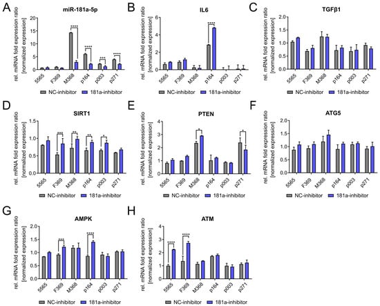 To further confirm our results, we transfected an miR-181a-5p inhibitor into the same cell strains and analyzed the mRNA expression levels of the potential target genes. As shown in Figure 4A, miR-181a-5p levels were significantly reduced in most cell strains following inhibitor treatment. Also, miR-181a-5p levels varied among negative control-treated cells, likely due to a transfection-induced stress response [73]. When comparing the IL-6 mRNA expression following inhibitor treatment, we observed only a partial effect (Figure 4B). TGFβ1 expression remained unchanged during this treatment (Figure 4C). In contrast, significant changes in SIRT1 mRNA levels were observed in most cell strains, indicating the critical role of miR-181a-5p in SIRT1 regulation (Figure 4D). PTEN, AMPK, ATG5, and ATM mRNA expression levels were not significantly changed and showed no consistent trend of increase or decrease (Figure 4E–H).