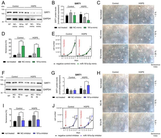 To test whether miR-181a-5p regulates senescence and cell-cycle progression, we transfected three control and HGPS fibroblast strains with an miR-181a-5p mimic. Following transfection, miR-181a-5p levels increased by 5000- to 30,000-fold depending on the strains (Figure 3B). As shown in Figure 5A,B, SIRT1 protein levels were reduced in both control and HGPS fibroblasts after miR-181a-5p mimic transfection (Figure 5A,B; corresponding full-scan blots, Figure S2A,B). However, the downregulation in control cells was not statistically significant. In contrast, p21 (CDKN1A), a key downstream target of p53, was significantly upregulated in control fibroblasts, although it did not reach statistical significance in HGPS cells (Figure S1A,B; corresponding full-scan blots, Figure S3). To assess the impact of miR-181a-5p on senescence, we treated fibroblasts with the miR-181a-5p mimic for 9 days and monitored senescence progression. As shown in Figure 5C,D, senescence levels increased following negative control transfection and were further elevated upon miR-181a-5p overexpression. The increase in senescence during negative-control transfection likely reflects transfection-induced cellular stress, which is known to activate proinflammatory cytokines and SASP markers [73]. Despite no changes in fibroblast growth after 6 days of miR-181a-5p mimic treatment, we anticipate a progressive decline in growth rate upon prolonged exposure due to senescence induction (Figure 5E). Given that miR-181a-5p is downregulated in various cancers and implicated in tumor suppression, we hypothesized that inhibiting miR-181a-5p would delay senescence [79,80]. To test this, we transfected control and HGPS fibroblasts with the miR-181a-5p inhibitor. As shown in Figure 4A, miR-181a-5p levels were significantly reduced in most cell strains following inhibitor treatment. Western blot analysis of SIRT1 after miR-181a-5p inhibitor treatment showed a restoration of SIRT1 protein levels (Figure 5F,G and Figure S2C,D). By day 9 of miR-181a-5p-inhibitor treatment, we observed a significant reduction in the proportion of senescent cells (Figure 5H,I). The increase in senescence with the negative control inhibitor treatment is again likely due to transfection-induced stress [73,81]. Fibroblast proliferation was significantly enhanced after 6 days of inhibitor treatment in both control and HGPS cells, confirming the restoration of cellular proliferation and cellular homeostasis by miR-181a-5p inhibition (Figure 5J). As expected, we also observed a decreasing trend of p21 protein levels. Although these changes were not significant after 6 days of treatment, the trend supports the attenuation of senescence observed after 9 days (Figure S1C,D; corresponding full-scan blots, Figure S3).