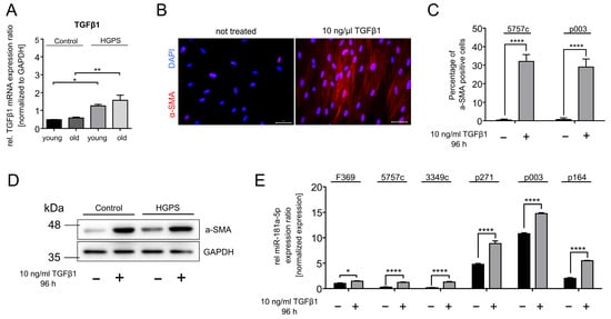 Elevated TGFβ1 levels in HGPS promote upregulation of miR-181a-5p expression. (A) TGFβ1 mRNA expression level in three control (GMO5565, GMO5757c, HGFDFN369) and HGPS (HGADFN127, HGADFN003, HGADFN164) fibroblast cell strains. Comparisons were made between the young and old stages intragroup as well as same-aged stages. Expression was normalized to GAPDH. (B) Representative immunofluorescence staining of the control cell line 5757c P18 with α-SMA following TGFβ1 treatment. Scale bar = 50 µm (C) Quantification of immunofluorescence signal in control (GMO5757c P18) and HGPS (HGADFN003 P12) cell strains. Comparisons were made between treated and non-treated samples. (D) Western blot of α-SMA and GAPDH as a loading control in control (GMO5757c P18) and HGPS (HGADN271 P11) cell strains. (E) Relative miR-181a-5p levels following TGFß1 treatment in three control (HGFDFN369, GMO5757c, GMO3349c) and HGPS (HGADFN271, HGADFN003, HGADFN164) cell strains with a senescence index <5%. Expression was normalized to U6 small nuclear 1 (RNU-6). Comparisons were made between treated and non-treated samples. (A,C,E) Graphs show mean values ± standard deviation. Statistical significance was calculated using ANOVA with Tukey’s post hoc test (* p < 0.05, ** p < 0.01, **** p < 0.0001 (n = 3)).