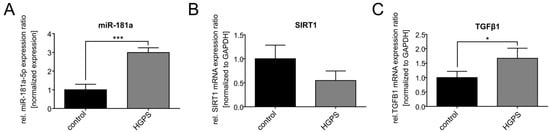 The upregulation of miR-181a-5p appears to be a response to chronic inflammation in HGPS, ultimately leading to SIRT1 suppression and cell-cycle arrest via p21 activation. Despite the significant changes in miR-181a-5p, SIRT1, and TGFβ1 in HGPS models and their known roles in senescence and HGPS progression, the limited number of biological replicates constrains the strength of our conclusions. Future studies with larger sample sizes will be necessary to validate the upregulation of miR-181a-5p in HGPS and further elucidate its impact on aging and disease pathogenesis. To strengthen the findings, monitoring of miR-181a-5p expression in response to progerin induction may also provide insights into their functional interplay. Future studies should further investigate the role of miR-181a-5p in HGPS progression and evaluate its potential as a therapeutic target in HGPS mouse models. Targeted modulation of miR-181a-5p expression may offer a promising therapeutic strategy to restore SIRT1 levels, counteract premature senescence in HGPS, and potentially influence normal aging processes.