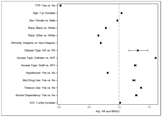 The study sample comprised all ESRD patients in the USRDS database who were between the ages of 18 and 100 years at the time of the start of dialysis and who began therapy between 1 January 2005 and 31 December 2018; these inclusion criteria allowed for follow-up and accrual of claims to determine the outcome (mortality) and independent variables that were controlled. Subjects with missing information, such as sex, race, ethnicity, age, or no or unknown incident dialysis modality or access type, were excluded from the study cohort. The number of included ESRD subjects totaled 1,155,136. These patients exhibited an average age of 63.8 (SD = 15.0); 44% were female; 27% were of black race; 7% were of other race; and 16% were Hispanic. Nearly all were on hemodialysis and the majority used a catheter for their access type (81%). Among the included cohort, 12% had hypothyroidism, 1.3% had illicit drug use, 13% used tobacco and 4% were alcohol-dependent.