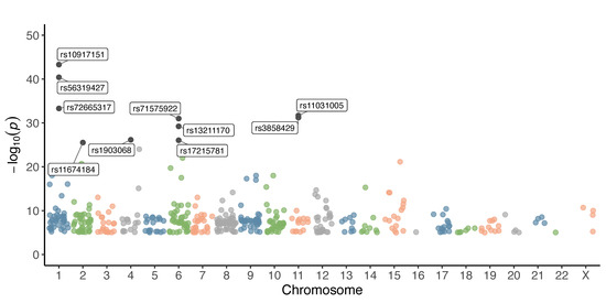 We began the analysis with the 465 endometriosis-associated variants retained after filtering, as described in the Section 2. These variants were distributed across all 22 autosomal chromosomes and the X chromosome. Chromosome 8 harbored the highest number of variants (n = 66), followed by chromosomes 6 (n = 43), 1 (n = 42), 2 (n = 38), 9 (n = 37), and 10 (n = 33). In contrast, chromosomes 16 and 22 contained only one variant each. A total of four variants were located on the X chromosome (Figure 1, Table 1). The ten most significant variants presented p-values ranging from 5 × 10−44 to 3 × 10−26. Four of these were located on chromosome 1: rs10917151 (p = 5 × 10−44), rs56319427 (p = 4 × 10−41), rs72665317 (p = 5 × 10−34), and rs11674184 (p = 3 × 10−26). Three variants were found on chromosome 6: rs71575922 (p = 1 × 10−31), rs13211170 (p = 6 × 10−30), and rs17215781 (p = 9 × 10−27). Variants rs11031005 (p = 2 × 10−32) and rs3858429 (p = 6 × 10−32) were located on chromosome 11, while rs1903068 (p = 7 × 10−27) was identified on chromosome 4 (Figure 1, Table 1).