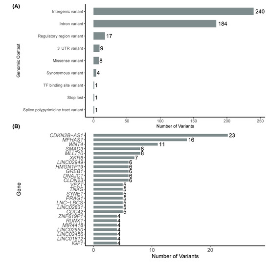 We also observed that some genes accumulated a higher number of associated variants. The top 20 genes with the highest counts included CDKN2B-AS1 (n = 23); MFHAS1 (n = 16); WNT4 (n = 11); SMAD3 and MLLT10 (n = 8); CDC42 and SKIDA1 (n = 7); and IL1A, FSHB, and RAB5B (n = 6). The top 10 genes with more GWAS-variants are shown in Figure 2B.