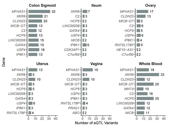 To characterize the most frequently affected genes, we identified the ten genes with the highest number of associated eQTL variants in each tissue. In whole blood, XKR6 was the most regulated gene (33 variants), followed by MICB-DT and HCP5 (25 variants each), and MFHAS1 (18). In the sigmoid colon, MFHAS1 (32 variants), XKR6 (21), and CLDN23 (20) were the top-ranked genes. In the ovary, MFHAS1 (17), CLDN23 (13), and USP4 (6) showed the highest regulatory counts. In the uterus, MFHAS1 (13), CLDN23 (10), and XKR6 (5) were the most affected. In the vagina, the top regulated genes included MFHAS1 (15), CLDN23 (10), and MICB-DT (4). Lastly, in the ileum, XKR6 (7), IP6K1 (6), and a group of genes with three variants each (LINC00208, GATA4, USP4) were the most frequent (Figure 3).