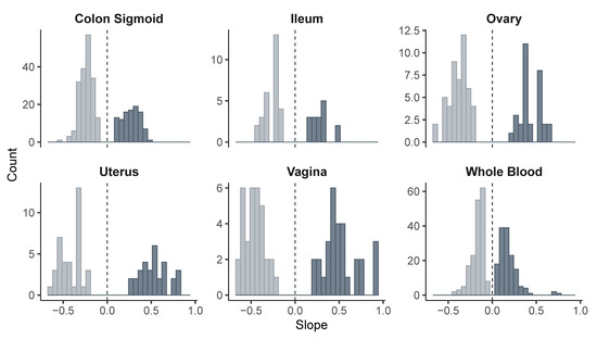 We then evaluated the overall distribution of the regulatory effects by analyzing the slope values in each tissue. In all cases, both positive and negative effects on gene expression were observed. In the sigmoid colon, a bimodal distribution of slope values was evident, while in whole blood, effects were concentrated near zero. In the ileum, ovary, uterus, and vagina, the distributions were broader, with variants associated with both increased and decreased gene expression (Figure 4).