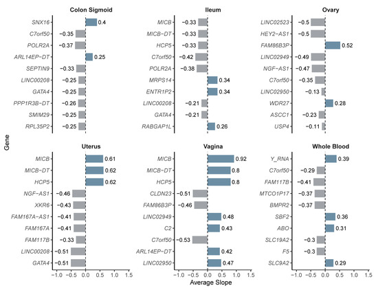 Next, we calculated the average slope values per gene and tissue to identify those with the strongest regulatory effects. In the vagina, MICB, MICB-DT, and HCP5 had the highest slope values (≥0.8), regulated by variants rs2534685, rs2534687, and rs2894221, respectively. In the uterus, these same genes showed slopes around 0.62, while GATA4 and LINC00208, regulated by rs13248109, rs13250871, and rs4840573, displayed more pronounced negative effects (slope ≈ −0.51).