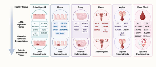 eQTL-regulated genes in endometriosis. In healthy tissue, genes modulated by eQTL variants may dysregulate molecular pathways and trigger pathogenic processes that promote the development of endometriosis. For example, in the sigmoid colon and ileum, the regulation of C2 and POLR2A may impact complement/coagulation pathways and DNA repair mechanisms, generating a pro-inflammatory state with potential genomic instability (Table 3). In reproductive organs (uterus and ovary), eQTLs regulating MICB, MFHAS1, and CLDN23 may alter estrogen response and heme metabolism, linking to tumor inflammation signatures, sustained proliferation, and the evasion of growth suppressors (Table 3 and Table 4). Likewise, the modulation of GATA4 and BMPR2 activates sustained angiogenesis and immune evasion pathways (Table 4), which may be essential for the vascularization and survival of ectopic implants. In the vagina, variants regulating MFHAS1, CLDN23, and MICB-DT affect epithelial barrier integrity and enhance local inflammatory signals and immune evasion (Table 3 and Table 4), facilitating the establishment of ectopic lesions in this tissue. Similarly, in peripheral blood, eQTLs regulating MICB, HCP5, and F5 may promote the reprogramming of immune evasion and systemic angiogenesis (Table 4), suggesting an immunovascular component that could amplify pro-endometriotic signaling at distant sites. These examples demonstrate how, starting from an initially healthy tissue, eQTLs in key genes may orchestrate biological cascades that predispose to the implantation, proliferation, and persistence of endometrial tissue in ectopic locations. NLH refers to genes not linked to any hallmark (Table 3 and Table 4), created with Biorender.com, accessed on 6 July 2025.