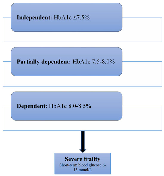 The participants in the studies associating low glycaemia with frailty have a high prevalence of malnutrition, which could be an explanation of this relationship [87,88]. Studies reporting poor glycaemic control and time spent in hyperglycaemia accelerating the risk of frailty in non-frail obese subjects could be explained by increased chronic inflammation and increased insulin resistance [85,90]. Therefore, for reducing the risk of frailty in non-frail subjects, good glycaemic control of HbA1c around 7.5% and reduction in blood glucose level variability is required. For already frail older people, a target that ranges from 7.5 to 8.5% is reasonable depending on function [96]. (Figure 2) This population is unlikely to benefit from tight glycaemic control due to the competing effects of their associated morbidities [97]. As the severity of frailty increases and function declines, targets should focus on short-term day-to-day blood glucose levels between 6 and 15 mmol/L rather than a long-term HbA1c target, as values outside this range may result in cognitive changes [98] (Table 2).