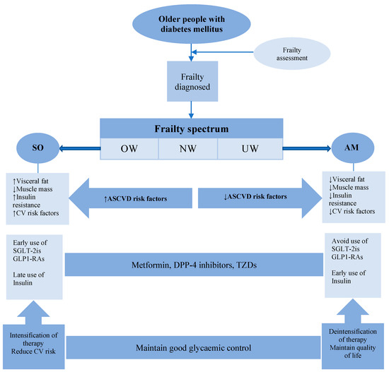 Choice of hypoglycaemic therapy in frail older people with diabetes. Clinicians should be consider hypoglycaemic agents with low threshold of hypoglycaemia. Sulfonylureas and meglitinides are better avoided due to risk of hypoglycaemia and alfa-glucosidase inhibitors due to gastrointestinal side effects. Metabolic frailty phenotype should be considered when using SGLT-2 inhibitors and GLP-1RAs, which should be used early in the SO phenotype and avoided in the AM phenotype. Low threshold for insulin use in the AM phenotype due to its anabolic properties. SO = sarcopenic obese, OW = Overweight, NW = Normal weight, UW = Underweight, AM = Anorexic malnourished, CV = Cardiovascular, ASCVD = Atherosclerotic cardiovascular disease, SGLT-2i = Sodium glucose cotransporter-2 inhibitors, GLP-1RAs = Glucagon like peptide receptor agonists, DPP-4 = Dipeptidyl peptidase, TZDS = Thiazolidinediones.