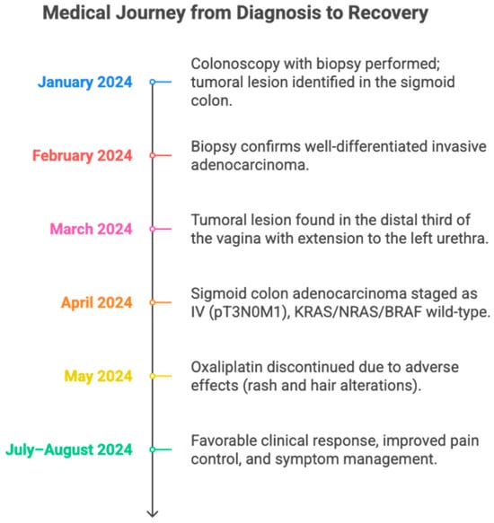 A timeline summarizing the clinical evolution of a patient with sigmoid colon adenocarcinoma metastatic to the vagina and urethra. It details the main diagnostic, therapeutic, and treatment response milestones between January and August 2024. The figure highlights the utility of a multidisciplinary approach and individualized adjustment of oncological management.