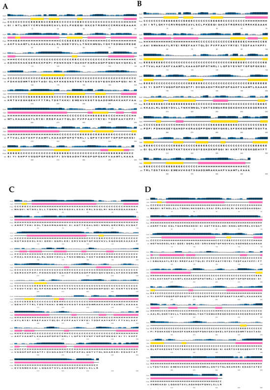 The secondary structures of the MEV constructs were predicted using PSIPRED (http://bioinf.cs.ucl.ac.uk/psipred/ (accessed on 1 September 2023)) [94], a PSI-blast-based secondary structure prediction tool.