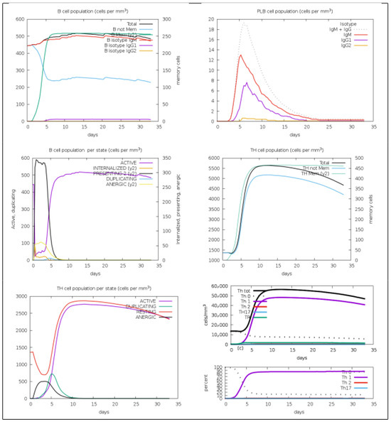 To simulate the real-life immune response, computational immune stimulation was conducted using the C-ImmSim online tool (https://kraken.iac.rm.cnr.it/C-IMMSIM/index.php?page=1 (accessed on 1 October 2023)). The default parameters were used for simulation, except for the time steps, which were set at 1, 84, and 170 (time step 1 represents the initial injection at time = 0, with subsequent injections every 8 h). The simulation was conducted with three injections, each four weeks apart, corresponding to the recommended interval between doses for most commercial vaccines [106].