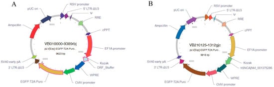 Given that lentiviral vectors can integrate into the host genome and enable stable long-term gene expression [] and that the EF1A promoter has the highest stability in embryonic stem cells [], the lentiviral system was selected as the delivery vehicle, with EF1A as the promoter and human SNCA cDNA as the target gene for expression. The designed hSNCA-NLS plasmid and the EGFP empty plasmid were sent to VectorBuilder Inc. (Chicago, IL, USA) for the construction and packaging of the mammalian gene expression lentiviral vectors pLV-hSNCA-NLS and pLV-EGFP (Figure 1).