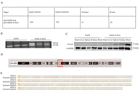 In recent years, the nuclear localization of α-syn has been increasingly observed in the tissues of patients with various neurodegenerative diseases []. However, the relationship between α-syn nuclear localization and PD, which ranks as the second most common neurodegenerative disease, remains unclear. Therefore, in this study, we aimed to investigate this relationship via a transgenic mouse model in which human α-syn was localized to the cell nucleus. To achieve this goal, we selected the EF1A promoter, known for its high stability in embryonic stem cells [], and the lentiviral vector, which offered good safety and high integration efficiency [,]. We constructed a lentiviral vector (pLV-hSNCA-NLS) by linking the nuclear localization signal (NLS) from Simian Vacuolating Virus 40 (SV40) to the cDNA of human SNCA. Additionally, we created a control vector (pLV-EGFP) expressing enhanced green fluorescent protein (EGFP). These vectors were then injected into fertilized mouse eggs to establish a transgenic mouse model with nucleus-localized human α-syn. The successful establishment of this model was subsequently confirmed through PCR, genomic DNA sequencing, Western blotting, and immunofluorescence techniques.