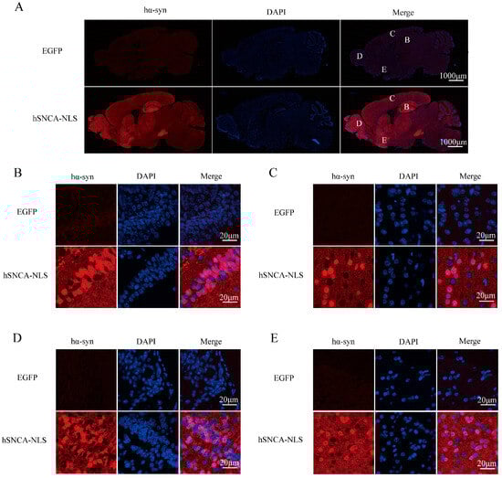 Human α-syn exhibited distinct colocalization with the cell nucleus. (A) Expression of human α-syn in the entire brain region. B, C, D, and E represent the hippocampus, cerebral cortex, olfactory bulb, and ventral tegmental area, respectively. (B) Colocalization of human α-syn in the hippocampus. (C) Colocalization of human α-syn in the cerebral cortex. (D) Colocalization of human α-syn in the olfactory bulb. (E) Colocalization of human α-syn in the ventral tegmental area. Original images are provided in Supplementary Figure S2.