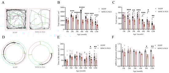 Given that the primary clinical feature of PD patients was motor dysfunction [] and that the open-field test was a behavioral experiment used to assess the locomotor ability of mice [], we assigned 13 identified male nuclear localization human α-syn transgenic mice as the experimental group and 13 male EGFP mice as the control group. These groups were subjected to open-field tests (p < 0.001 or p < 0.0001) (Figure 4A,B) and rotarod tests (p < 0.05, p < 0.01 or p < 0.001) (Figure 4C) at 1, 2, 3, 4, 6, 9, and 12 months of age. The results indicated that the experimental group exhibited significant motor impairments as early as 2 months of age, which persisted until 12 months, demonstrating that the nuclear localization of human α-syn in the transgenic mice resulted in motor dysfunction at an earlier stage. Since 30–40% of PD patients clinically exhibited significant anxiety symptoms [] and the prevalence of anxiety disorders in PD patients is significantly greater than that in the general population [], we conducted an O maze test (p < 0.05, p < 0.01) (Figure 4D,E) at the same time points. The experimental group displayed anxiety-like behaviors starting at 9 months of age, which continued until 12 months. Considering the anxiety-like behaviors observed in the nuclear localization human α-syn transgenic mice during the behavioral test, we examined the expression of the GABA gene, a key emotional factor. The results revealed that the expression of the GABA gene in these transgenic mice significantly decreased at 9 months of age but remained significantly reduced until 12 months of age (p < 0.05, p < 0.01) (Figure 4F).