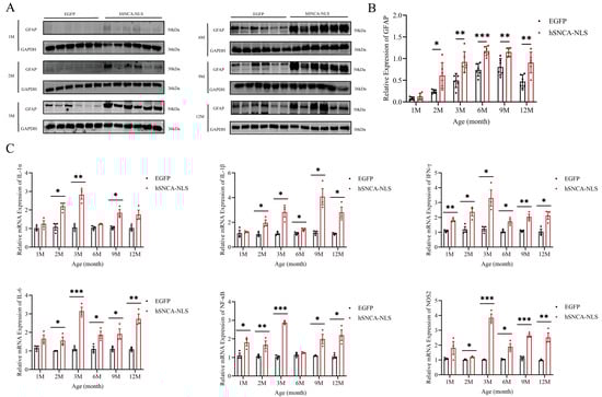 Given the close association between PD and astrocytes [], we examined astrocyte activity in the brain tissues of both groups of male mice. In the nuclear localization of human α-syn in transgenic mice, the expression of glial fibrillary acidic protein (GFAP), a marker of astrocytes, began to significantly differ as early as 2 months of age, and this significant difference persisted until 12 months of age (p < 0.05, p < 0.01 or p < 0.001) (Figure 5A,B). Under pathological conditions, astrocytes have been shown to produce inflammatory cytokines. Therefore, we further investigated whether an inflammatory response had occurred in the brain tissues of these mice. The results revealed that IFN-γ and NF-κB levels in the brain tissues of nuclear localization human α-syn transgenic mice were already significantly different at 1 month of age, whereas levels of other inflammatory cytokines began to diverge at 2 months and remained altered through 12 months. (p < 0.05, p < 0.01, p < 0.001 or p < 0.0001) (Figure 5C).
