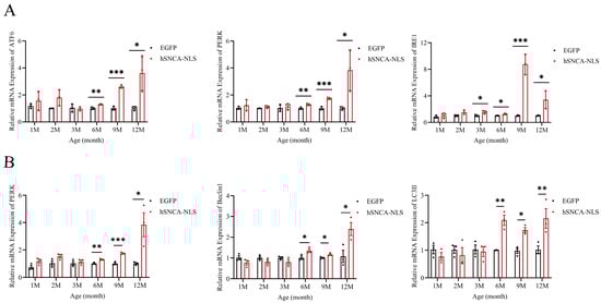 Considering the intimate association between ERS and inflammatory responses [], as well as the strong association between ERS and neurodegenerative diseases [], we examined the potential of brain tissue as an indicator of ERS. The results revealed that the ERS signaling pathway was fully activated in the mice at 6 months of age, and this activation persisted until 12 months of age (p < 0.05, p < 0.01 or p < 0.0001) (Figure 6A). Studies have indicated that the PERK-Beclin1-LC3II signaling pathway can modulate ERS to alleviate inflammatory responses []. In this study, qPCR analysis revealed that the expression levels of three key factors in this pathway—PERK, Beclin1, and LC3II—were increased in the nucleus of human α-syn transgenic mice at 6 months of age, and this increase continued until 12 months of age (p < 0.05, p < 0.01 or p < 0.001) (Figure 6B). These findings suggest that the PERK-Beclin1-LC3II signaling pathway was activated in these transgenic mice at 6 months of age. It is worth exploring whether nuclear localization in human α-syn transgenic mice can also alleviate ERS by activating the PERK-Beclin1-LC3II signaling pathway.