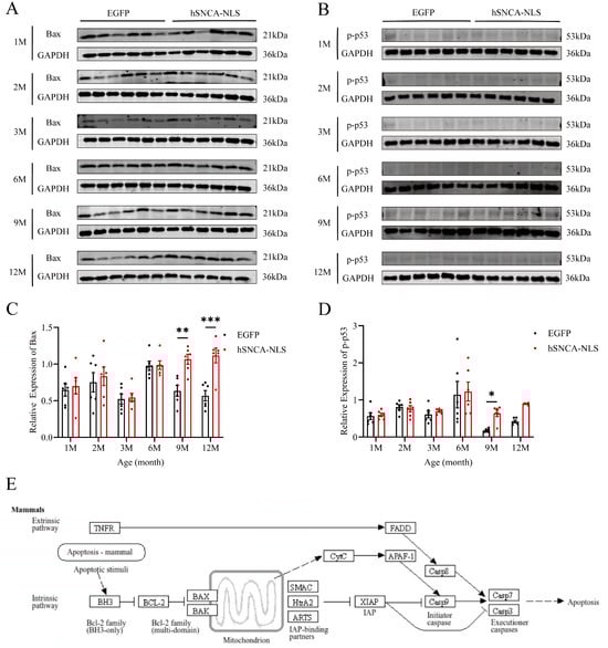 As the site of protein processing, the ER is susceptible to damage under stress conditions, leading to the accumulation of misfolded proteins and a characteristic stress response, known as the unfolded protein response (UPR). Chronic ERS can trigger the UPR to promote apoptosis []. Therefore, we examined the degree of apoptosis in the brain tissues of both groups of mice. In male human α-syn transgenic mice with nuclear translocation, the expression levels of the apoptosis-related proteins Bax (p < 0.01 or p < 0.001) (Figure 7A,C) and p-p53 (p < 0.05) (Figure 7B,D) were significantly different at 9 months of age, and these differences persisted until 12 months of age. Additionally, using the KEGG database (https://www.kegg.jp/kegg/pathway.html, accessed on 13 March 2024), we identified a cell apoptosis signaling pathway similar to that identified in our study (Figure 7E). Following endogenous apoptosis stimulation in mammalian cells, the BH3 domain of the antiapoptotic protein B-cell lymphoma-2 (Bcl-2) promotes dimerization among Bcl-2 family members, leading to increased expression of the apoptotic protein Bax. This, in turn, facilitates the binding of the apoptotic protein Smac from the mitochondria to X-linked inhibitor of apoptosis protein (XIAP), thereby neutralizing its inhibitory effect on caspase activity and thus promoting apoptosis.