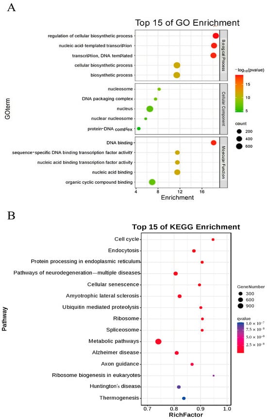 To further investigate the impact of nucleus-localized α-syn on mice, we performed Bulk RNA-seq on brain tissues from 12-month-old male mice, with three samples per group. Differentially expressed genes were analyzed via DEGSeq, and the selection criteria for significant differential expression were based on the fold change and q value (corrected p value). Genes with |log2Fold change| ≥ 1.5 and q < 0.01 were considered significantly differentially expressed. A total of 1155 upregulated and 568 downregulated genes were identified. qPCR validation was subsequently conducted on 10 selected differentially expressed genes, confirming significant differences in the expression of IL-1α, TNF, PERK, BECLIN, GABA, IL-6α, P53, LC3II, NOS, and SPAG8 between the two groups. Using the DAVID tool, we performed GO enrichment analysis on these differentially expressed genes and generated a bubble chart (Figure 8A). The GO enrichment results indicated that biological process (BP) terms were significantly enriched in cellular biochemical synthesis and nucleotide transcription; cellular component (CC) terms were enriched mainly in nucleosomes, DNA packaging complexes, nuclei, and protein–DNA complexes; and molecular function (MF) terms were enriched primarily in DNA binding and transcription factor activity and binding to organic cyclic compounds. KEGG enrichment analysis revealed several related signaling pathways, including the cell cycle, endocytosis, protein processing in the ER, various neurodegenerative diseases, and ubiquitin-mediated proteolysis (Figure 8B). Notably, the differentially expressed genes obtained from bulk RNA-seq and protein processing in the endoplasmic reticulum pathway identified through KEGG enrichment analysis were consistent with the experimental results presented in the preceding sections.
