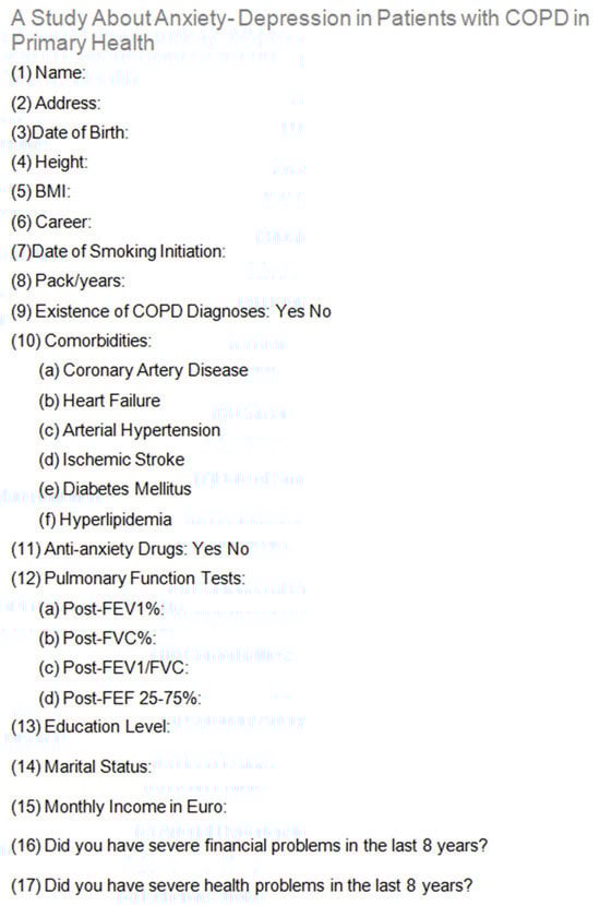 Demographic, socioeconomic, and clinical data related to COPD and its comorbidities were collected using a questionnaire designed by a group of experienced pulmonologists and administered at the Primary Health Care Center of Thessaloniki, Greece. The Greek version of the Hospital Anxiety and Depression Scale (HADS) questionnaire was self-administered by participants in a quiet outpatient setting, with trained staff available for assistance, to evaluate the presence of anxiety and depressive symptoms [26]. All participants successfully completed pulmonary function tests and answered all the questionnaire items.