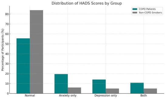 In the subgroup analysis among the COPD patients, individuals with elevated HADS scores differed significantly in certain clinical and sociodemographic parameters compared to those with normal scores. Specifically, a higher proportion of symptomatic patients belonged to GOLD Group B rather than Group A despite having preserved lung function, suggesting that the presence of symptoms, rather than airflow limitation, may be more strongly associated with psychological distress in early COPD.