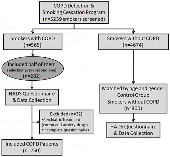Participants were selected from a total population of 5239 subjects (>40 years old, current or former smokers, ≥10 pack-years), of whom 565 were diagnosed with COPD. Of these, 264 had a prior correct diagnosis of COPD, while the remaining were undiagnosed. We included half of the total COPD cases, starting with the first diagnosed patient and then selecting every second one thereafter. Therefore, the final COPD group consisted of 282 patients. Thirty-two patients were excluded from the analysis because they did not adequately fill out the study or HADS questionnaire, left unanswered questions, or were already receiving psychiatric treatment for a coexisting psychiatric disease. Mild anti-anxiety medications were excluded because they are commonly used by non-psychiatric patients. An age- and gender-matched control group of 300 subjects without COPD was also included (Scheme 1).