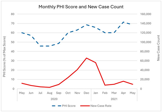 Figure 1 shows a positive correlation between new cases and PHI score. The first peak in new cases occurred in January 2021, whereas the PHI score peaked in December 2020. The second peak in cases occurred in April 2021, which coincided with the PHI peak. The Spearman’s rank-order correlation was positive and significant (ρ = 0.947, p < 0.0001). The correlation analysis with a one-month delay in new cases also showed a positive and significant correlation (ρ = 0.788, p = 0.0023).