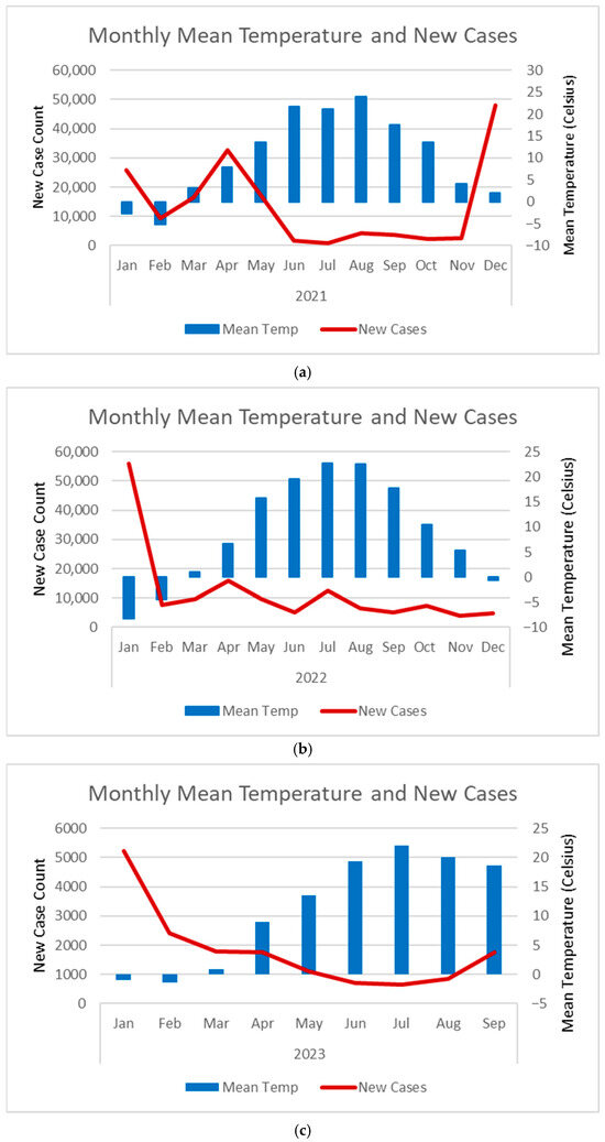 Figure 3. Trend of the monthly mean temperature and new case counts in Toronto for 2021 (a), 2022 (b), and from January 2023 to September 2023 (c). Solid red line = new case counts. Blue bar = mean temperature. The case data for Toronto is from the Public Health Ontario’s Respiratory Virus Tool https://www.publichealthontario.ca/en/Data-and-Analysis/Infectious-Disease/Respiratory-Virus-Tool (accessed on 18 September 2023). We calculated monthly new case counts by summing the weekly new cases reported for Toronto’s public health unit within each month. Temperature data is from Toronto International Airport weather station readings [23].