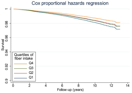 Furthermore, Cox proportional hazard analysis curves showed a significant difference in the probability of survival. Participants in the highest quartile of fiber intake had the highest probability of survival as compared with those in the lowest quartile of fiber intake. However, the survival curves overlapped between fiber intake quartiles 2 and 3, revealing higher survival rates in participants with higher fiber intake compared to those with lower fiber intake (Figure 1).