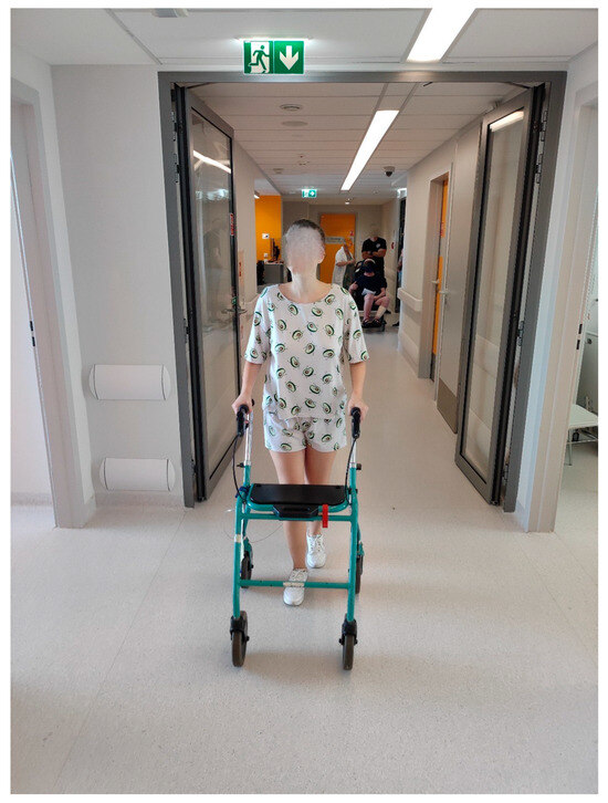 Her rehabilitation program included a comprehensive regimen: daily 60 min sessions involving breathing exercises, low-resistance active movement, conditioning and isometric training, balance re-education, and stair-climbing drills along with assisted ambulation with a walking aid (Figure 2). By mid-September, she began exercising with the Redcord suspension system, which allows for neuromuscular re-education and stabilization under reduced weight-bearing conditions. She also trained on stabilometric platforms using biofeedback technology to improve her postural control and proprioception. In response to the hypersensitivity in the lower limbs, the patient received massage as a part of a desensitization therapy aimed at modulating the abnormal sensory input.
