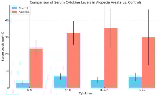 The increased serum levels of IL-6, TNF-α, IL-17A, and IL-21 in patch-type alopecia areata suggest a coordinated pro-inflammatory immune response. These cytokines are known to be involved in key intracellular signaling pathways that disrupt hair follicle immune privilege and promote autoimmune-mediated damage [10].