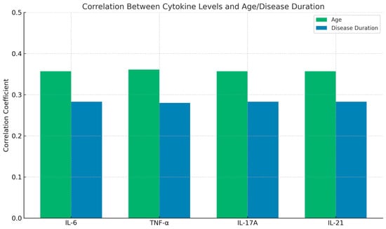 Further analysis revealed a positive correlation between cytokine levels and both age and disease duration. Higher serum levels of IL-6, TNF-α, IL-17A, and IL-21 were observed in older patients and those with a longer disease duration. These correlations were statistically significant (p < 0.05), as shown in Table 3 and Figure 2. These findings suggest that inflammatory cytokines may play a role in disease progression and severity over time.